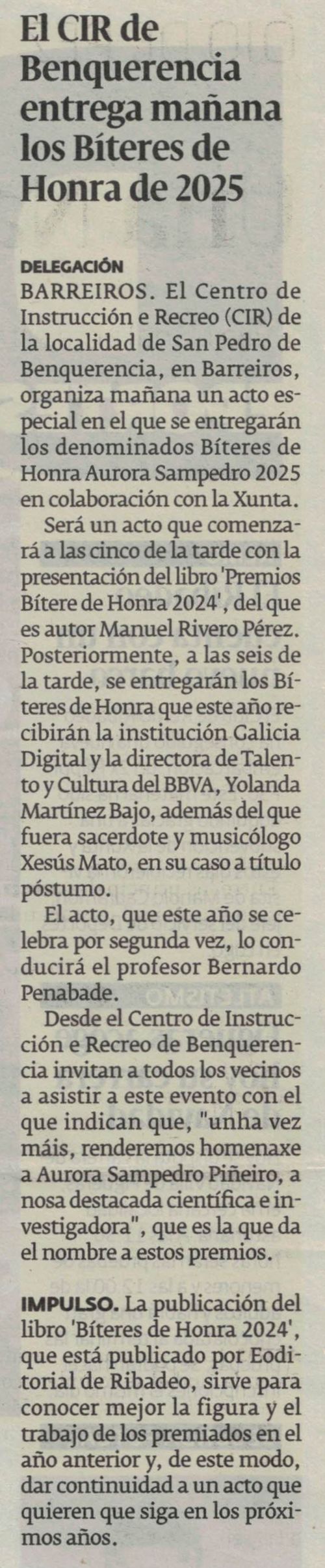 El CIR de Benquerencia entrega mañana los Bíteres de Honra de 2025 (El Progreso, 27/12/2025)